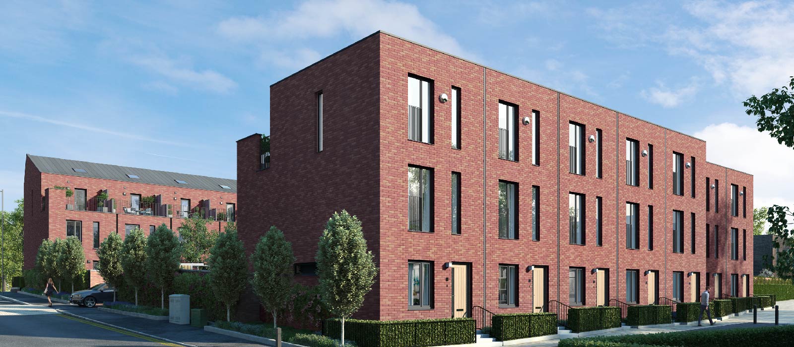 The development comprises three and four-bedroom townhouses, featuring a mixture of private rear gardens, rooftop terraces and patio areas. The homes surround an internal courtyard with parking spaces for each of the properties.