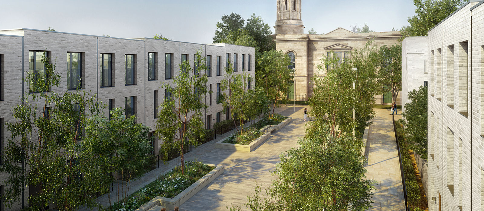 The development comprises 36 Georgian informed townhouses located in the stunning surroundings of the Grade 2 listed neo-classical Church of St Philip's and opposite Salford Cathedral. The two, three and four bedroom homes range in height, from two, three and four storeys. A landscaped communal courtyard sits at the heart of the development, with a pedestrian boulevard leading from the church.